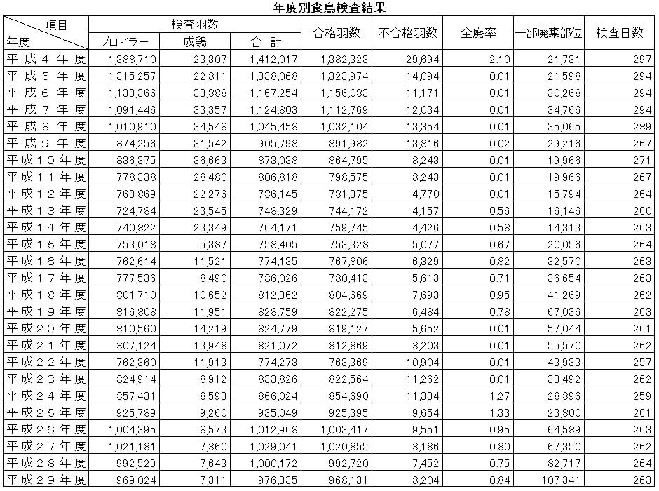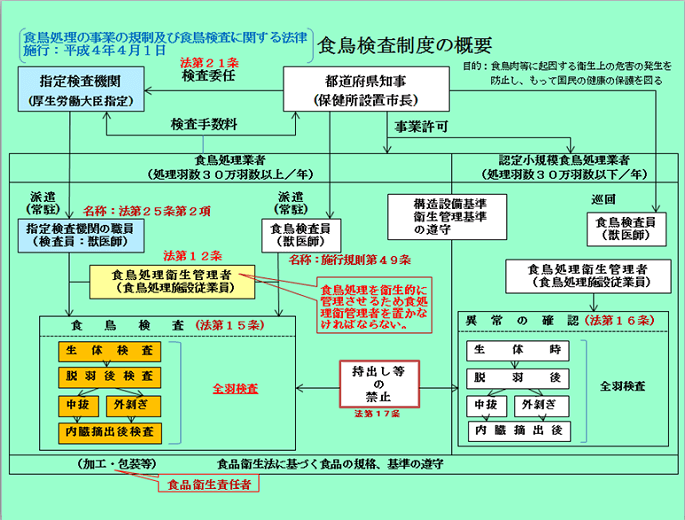 特に、大規模食鳥処理場(年間処理羽数が30万羽を超える施設)は、公的機関(都道府県知事又は厚生労働省指定検査機関)で食鳥検査を実施することが、「食鳥処理の事業の規制及び食鳥検査に関する法律(平成二年法律大七十号)」で義務づけられています。